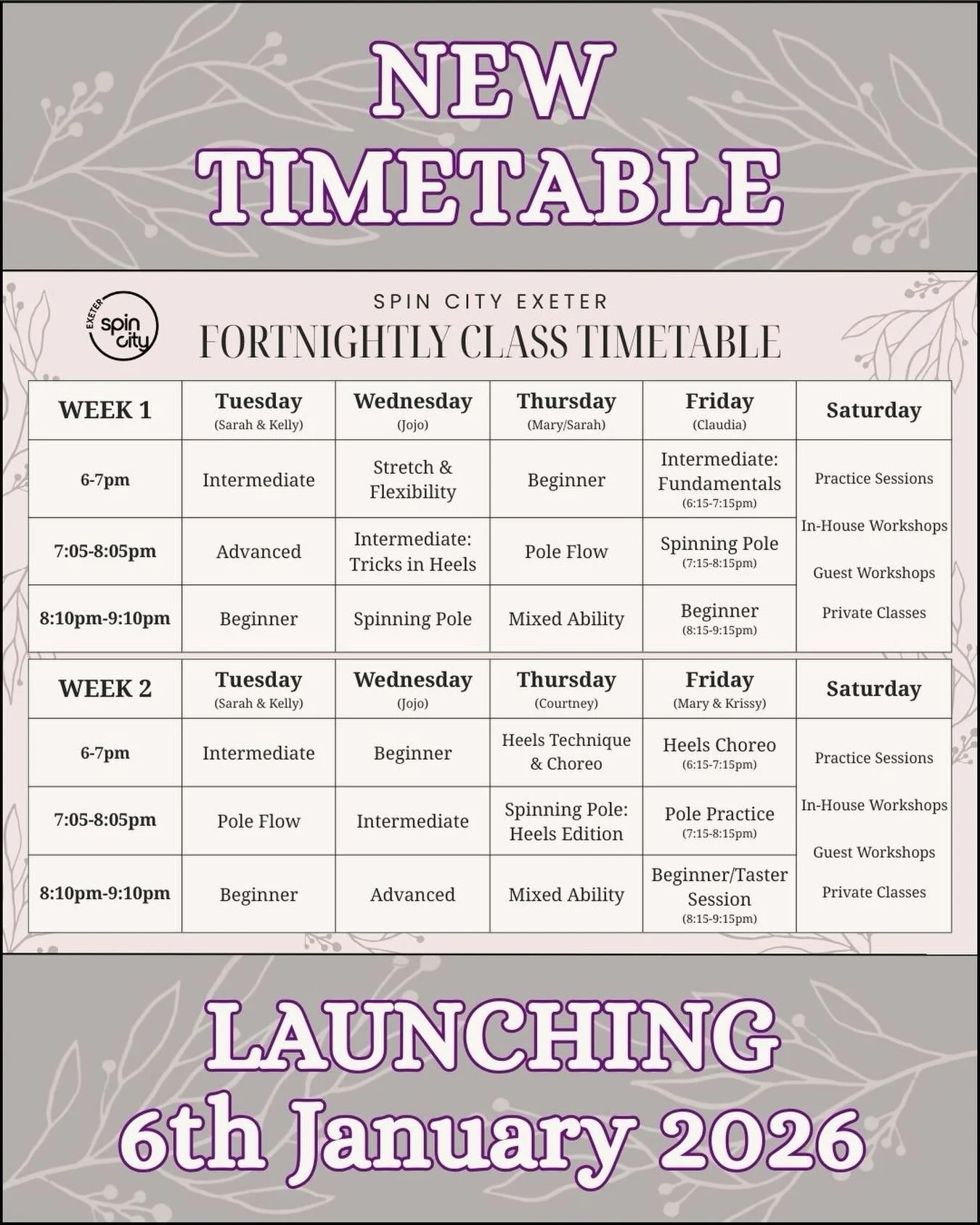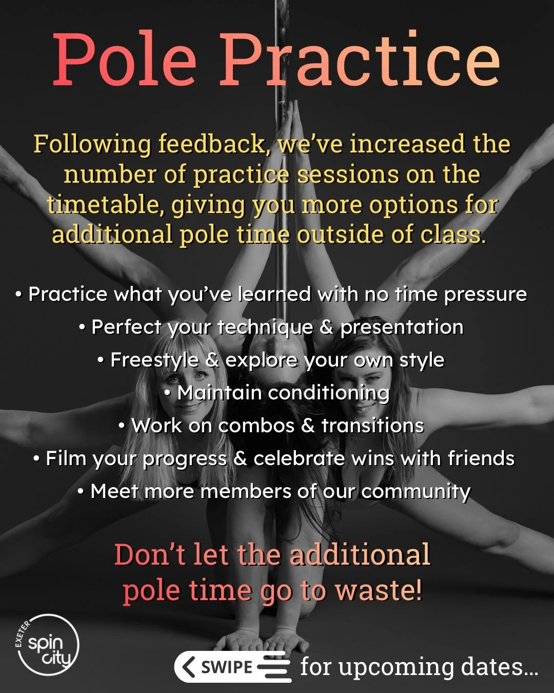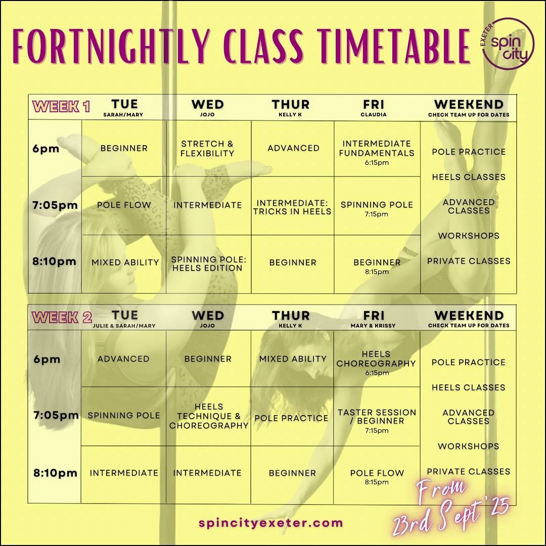 If you have never been to Spin City Exeter before, whether you are a complete beginner or if you have learnt pole elsewhere, you can join one of our taster sessions which are held once every four weeks. Alternatively you can book straight onto one of our regular classes. Book your place via the timetable and classes page, or the link in the banner at the top, and find out what pole is all about!